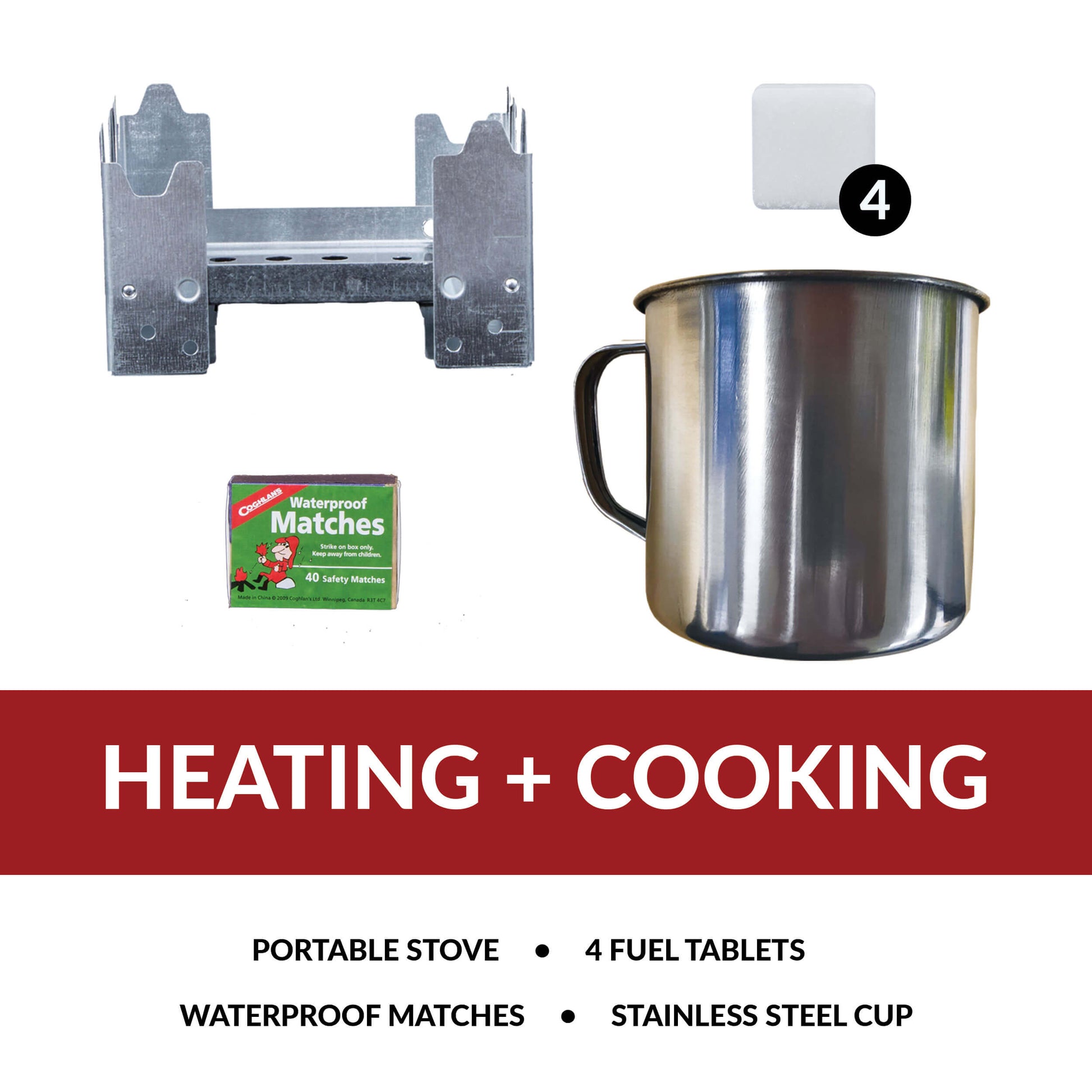 - A portable stove with fuel tablets lets you heat up your food and drinks.